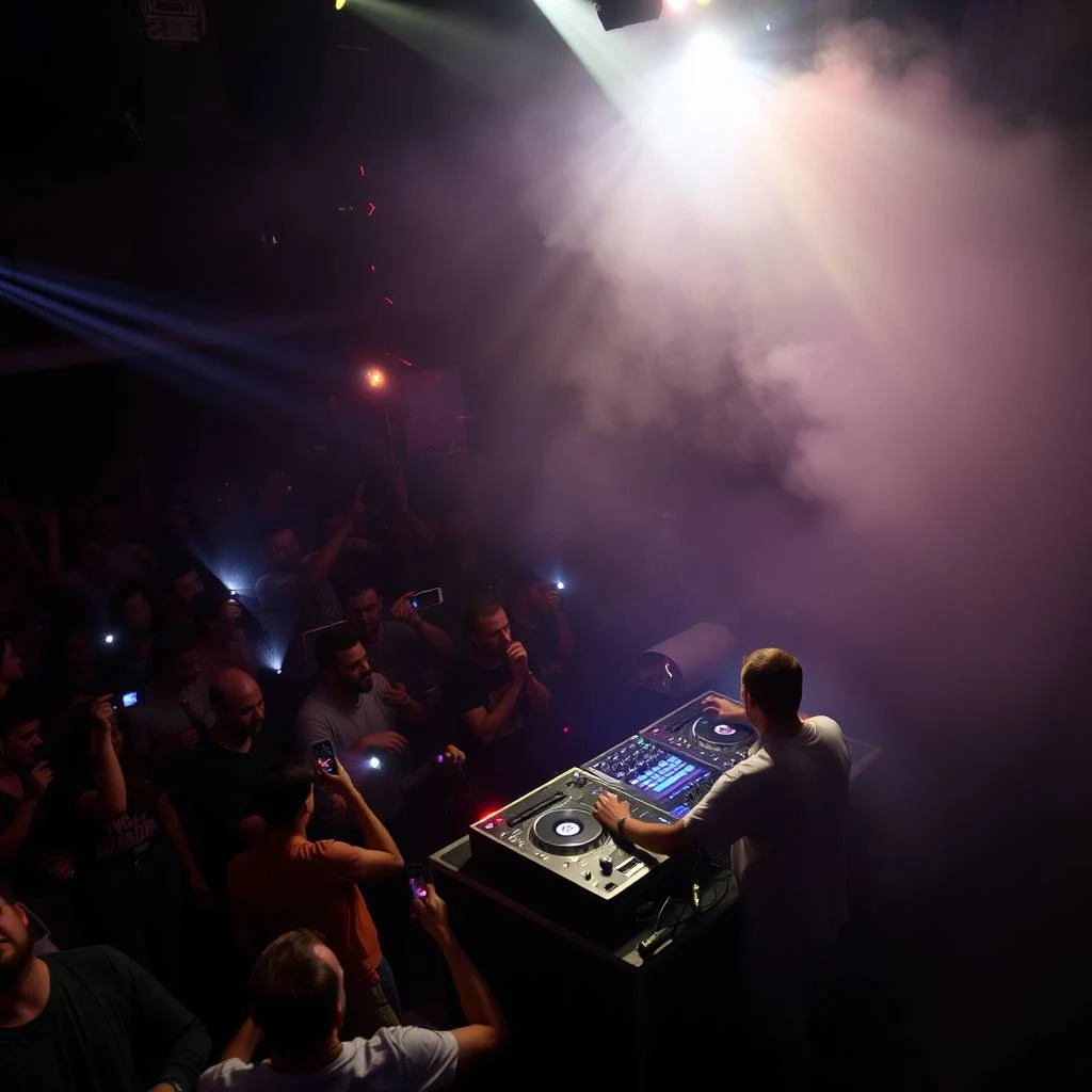 A Russian DJ performs on a stage while crowd keeps dancing. flashlights, smoke and night party