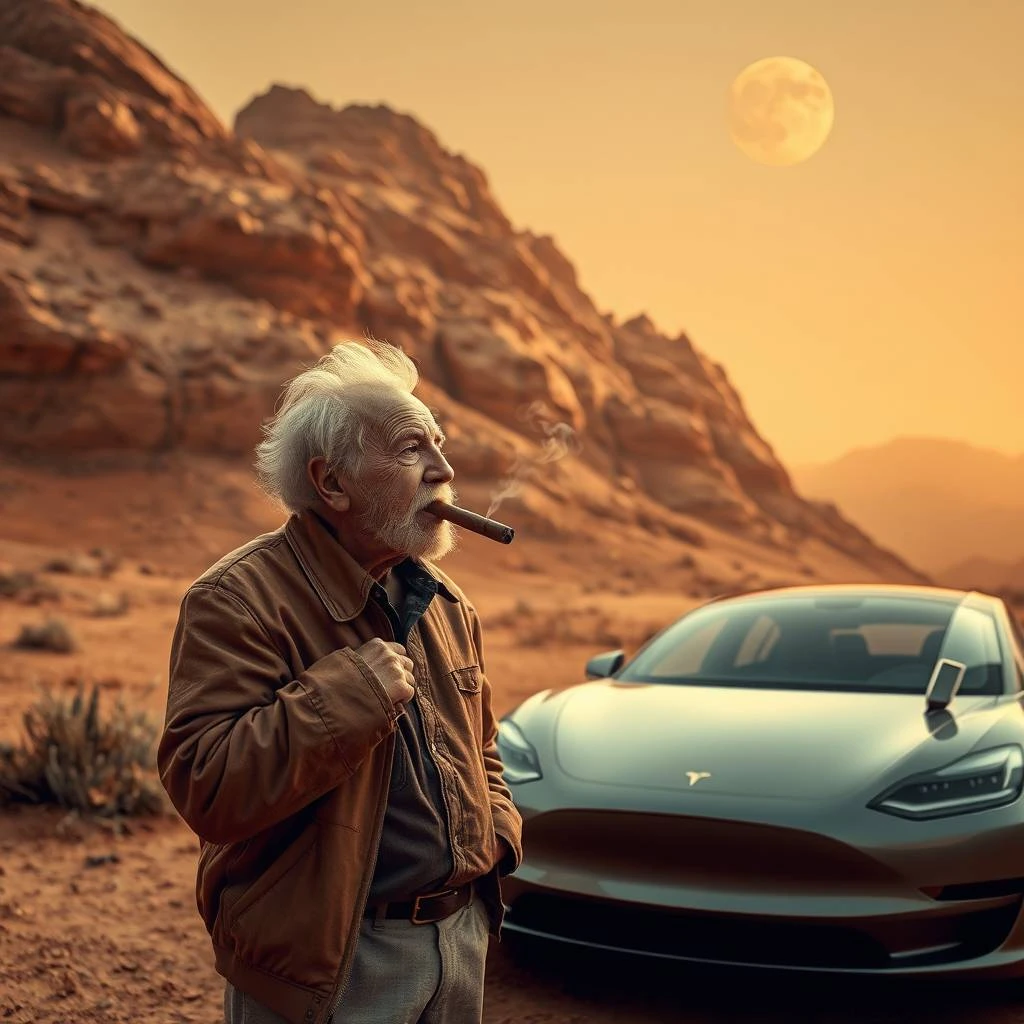 an old man smoking a cigar in Mars, Tesla car parked near him