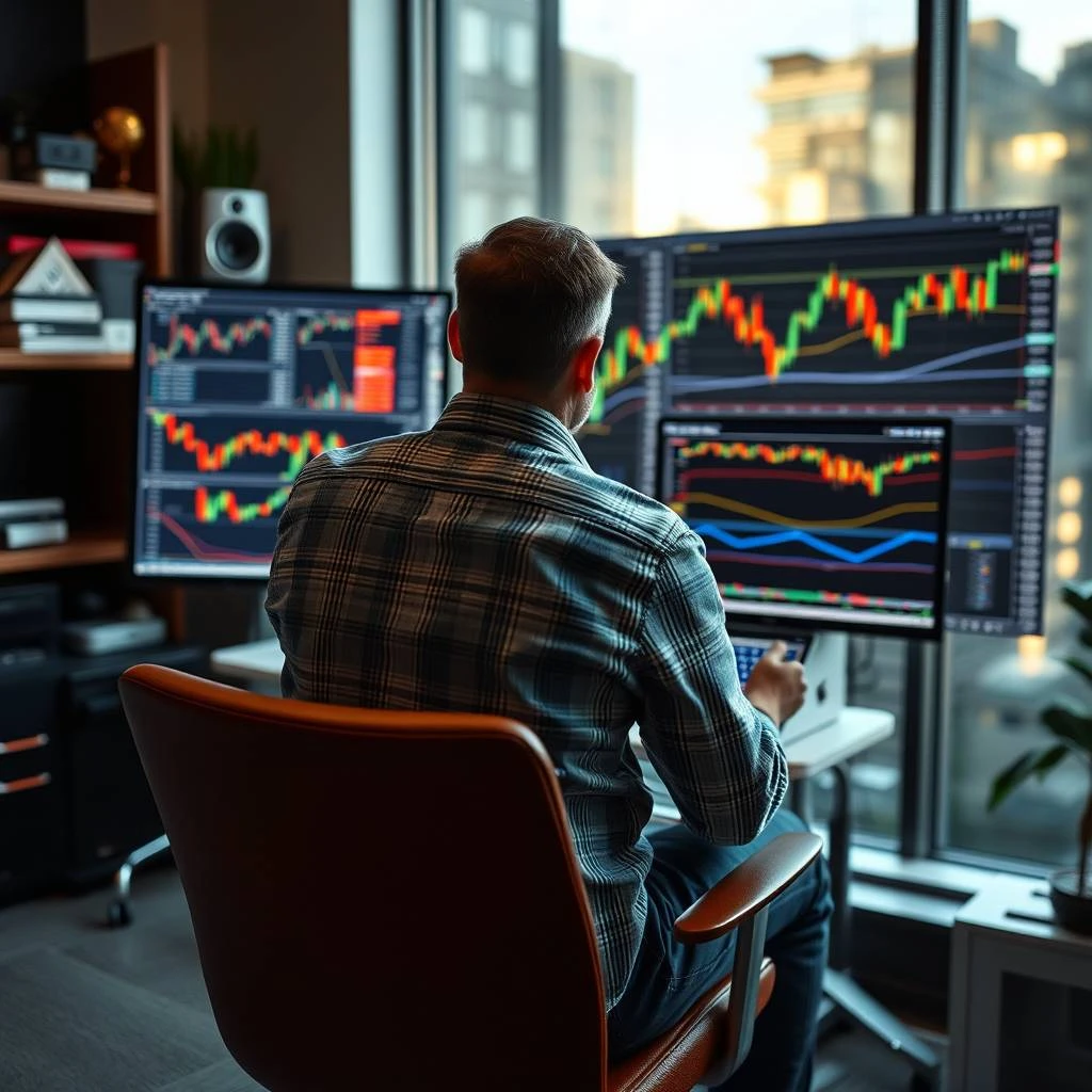 View from the back of a crypto trader sitting on a chair and analysing charts
