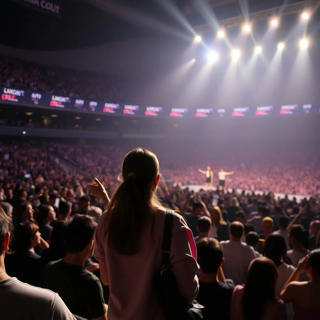 A girl watching stage show surrounded by thousands, the lights dim, and Blackpink steps on stage.