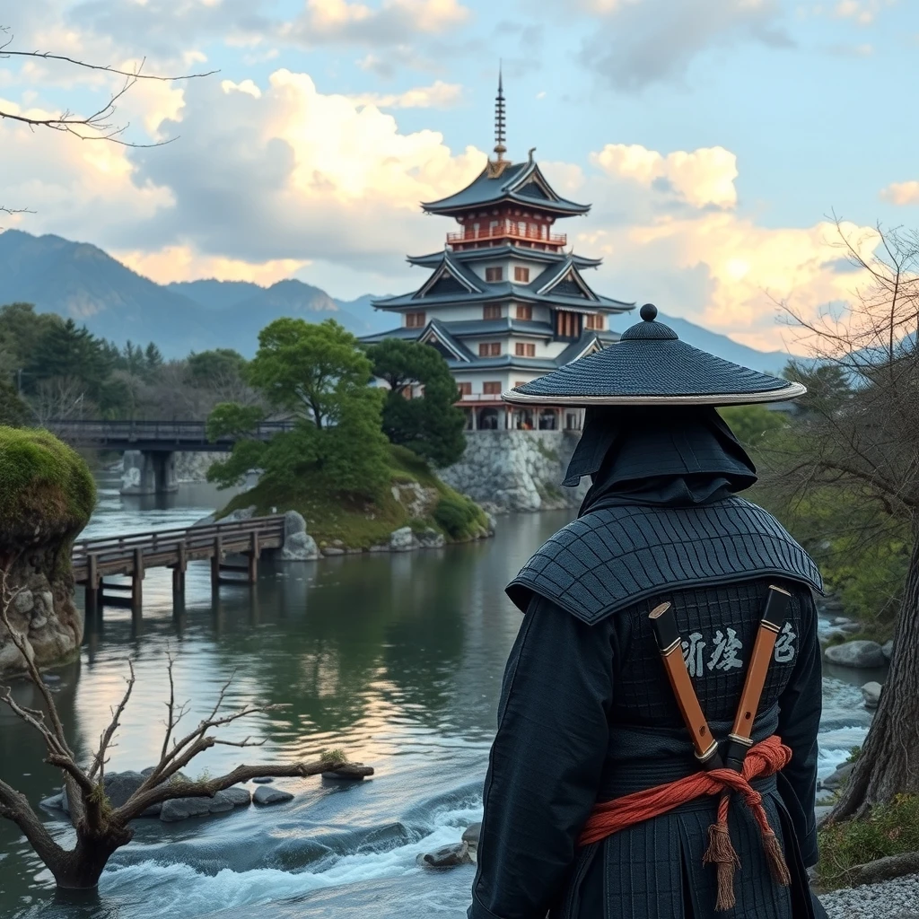a japanese samurai looking at river. castle is on a mountain otherwise of river.