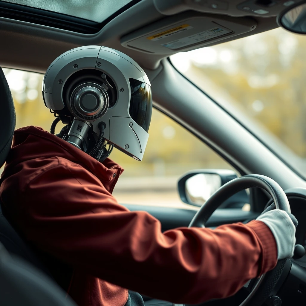 a man with a robot head driving a car