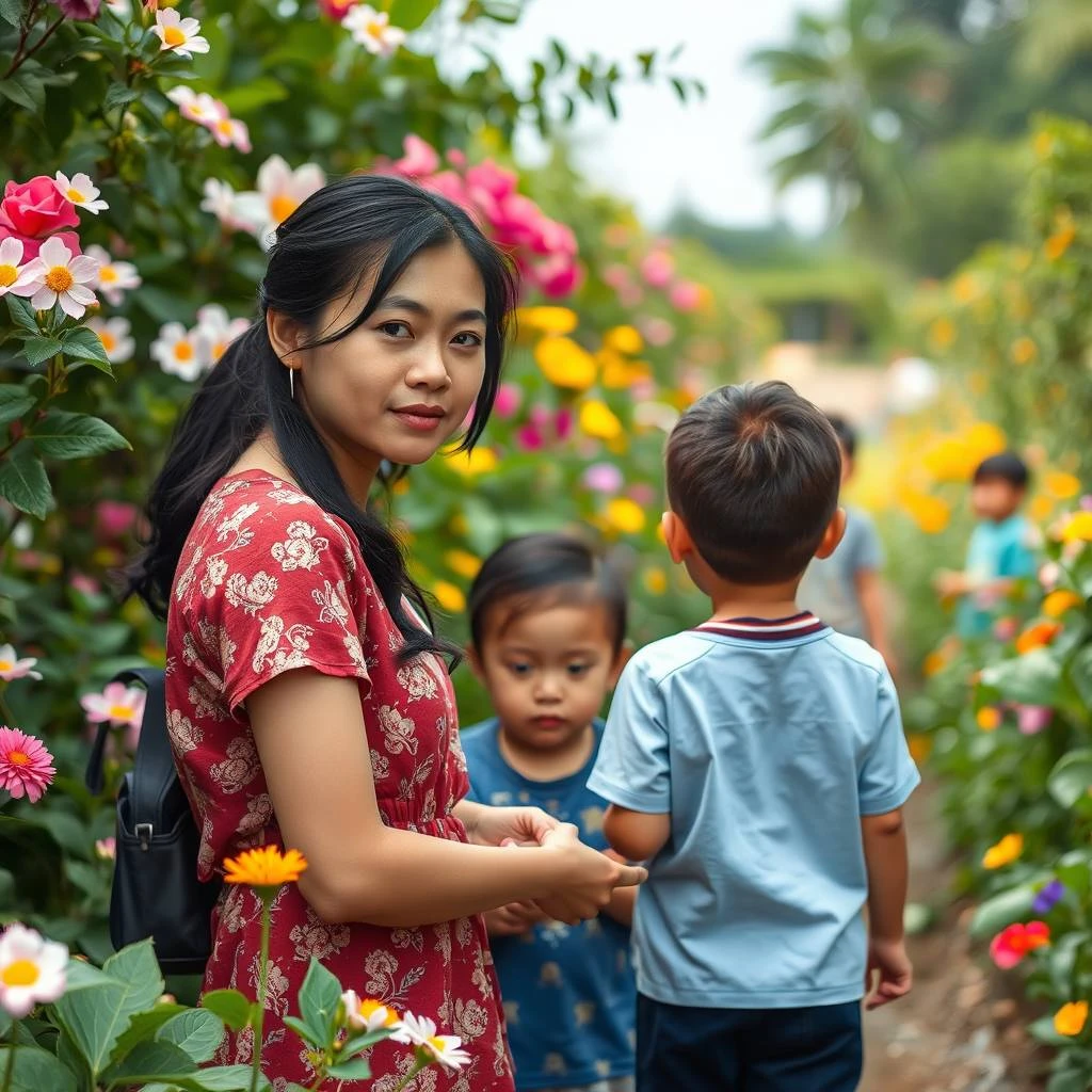 A flower garden with a young Vietnamese mother who looks after kids. Camera behind her and kids play faraway.