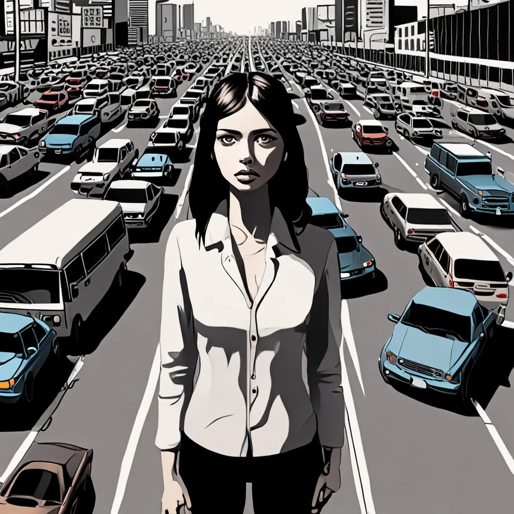 Jane Doe: stuck in a huge traffic road. look sad