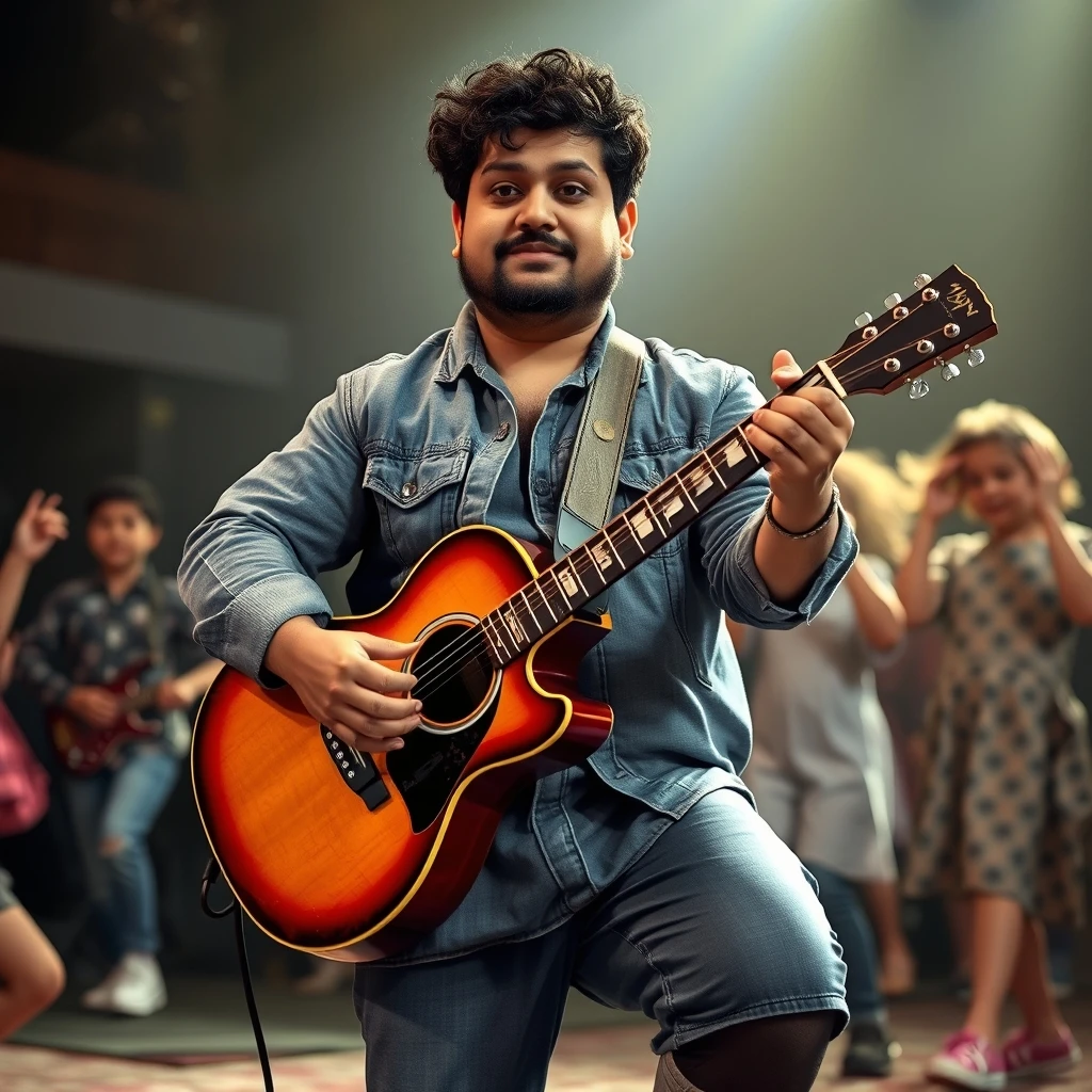 Priyankara Dilantha: playing guitar in musical show, kids dancing around him