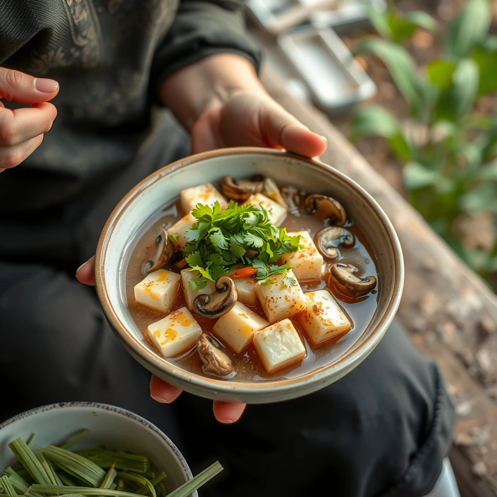 A vietnamese women fried tofu and steam with mushroom