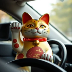 Maneki neko Lucky cat in front of the driving seat of a moving car