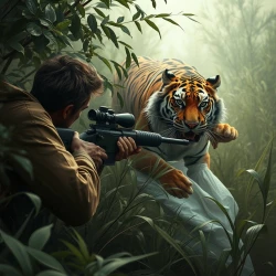 A sniper hiding in the bushes, tiger chasing a woman