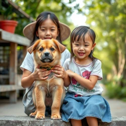 A cute puppy stand with a Vietnamese girl