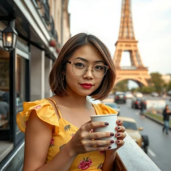 Nini Lee: drinking a coffee in Paris in front of Eiffel tower